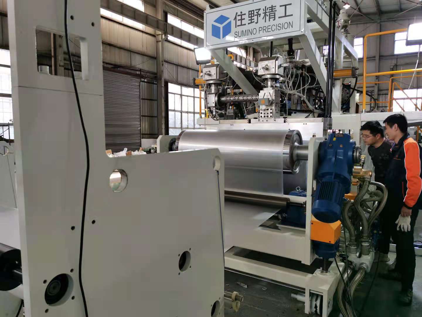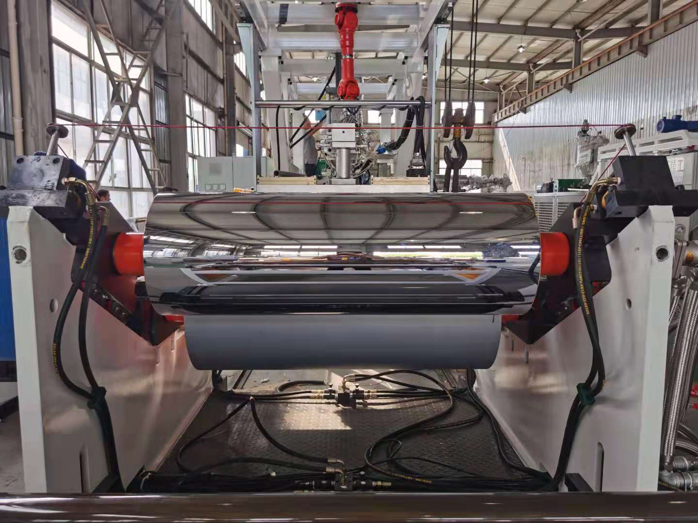 8)戴好防護手套,用手牽膜(mó)坯管運(yùn)行,達到一定高度時,把膜坯(pī)管拍扁(biǎn),粘合(hé)線(xiàn)與牽引(yǐn)輥平行(háng),然後送人兩(liǎng)牽引輥內被牽引輥夾緊,牽引運行,送入卷取裝置。此處(chù)應注意:進入牽引輥間的冷卻定型膜要平整,不允許有多層膜折疊在一起進(jìn)入輥內;更不允許把膜粘結成團狀從兩牽引輥間通過,以避免損壞牽引輥和傳動零(líng)件。