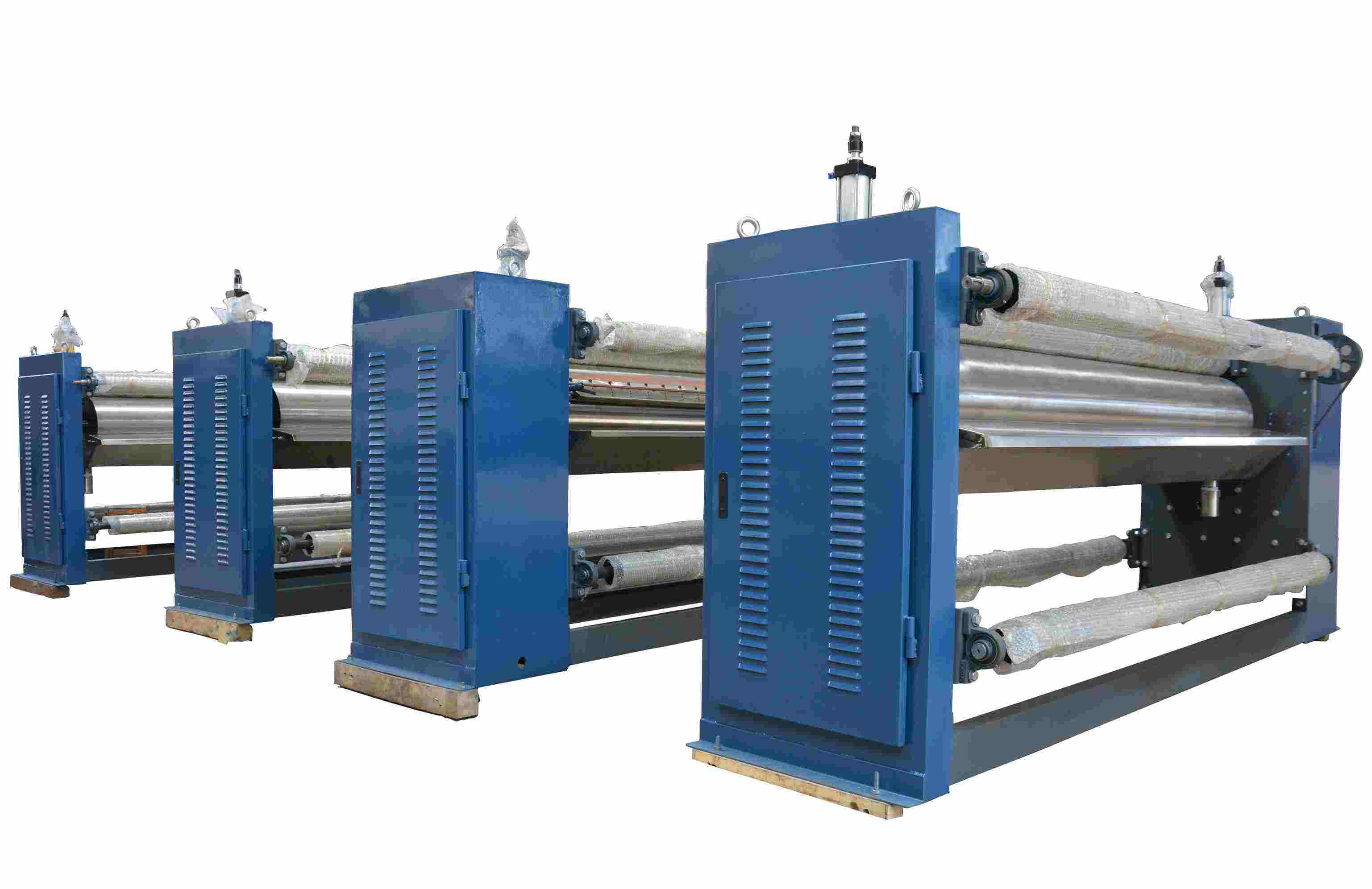6)在牽引輥和卷取裝置之間要加幾根導和展平輥,必要時(shí)也可加張力輥,以保證卷取膜捆平整、膜布卷取鬆緊一致。